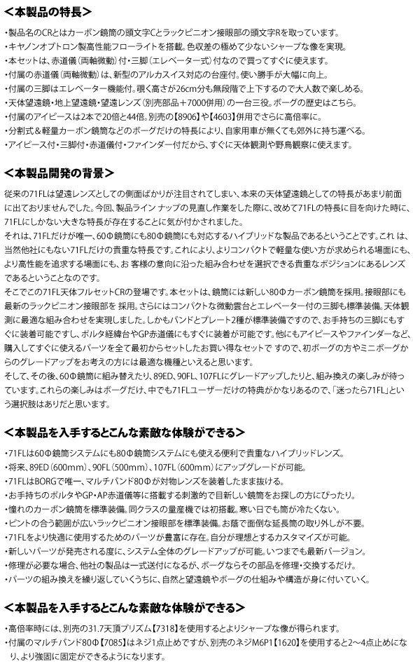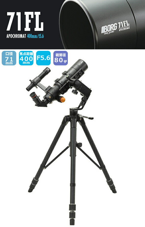 口径:55mmBORG71FL天体鏡筒セットCR 6371 BORG 商品番号:BORG-361価格:156400(税別)71FLのカーボン鏡筒+ラックピニオン接眼部仕様の天体望遠鏡登場。