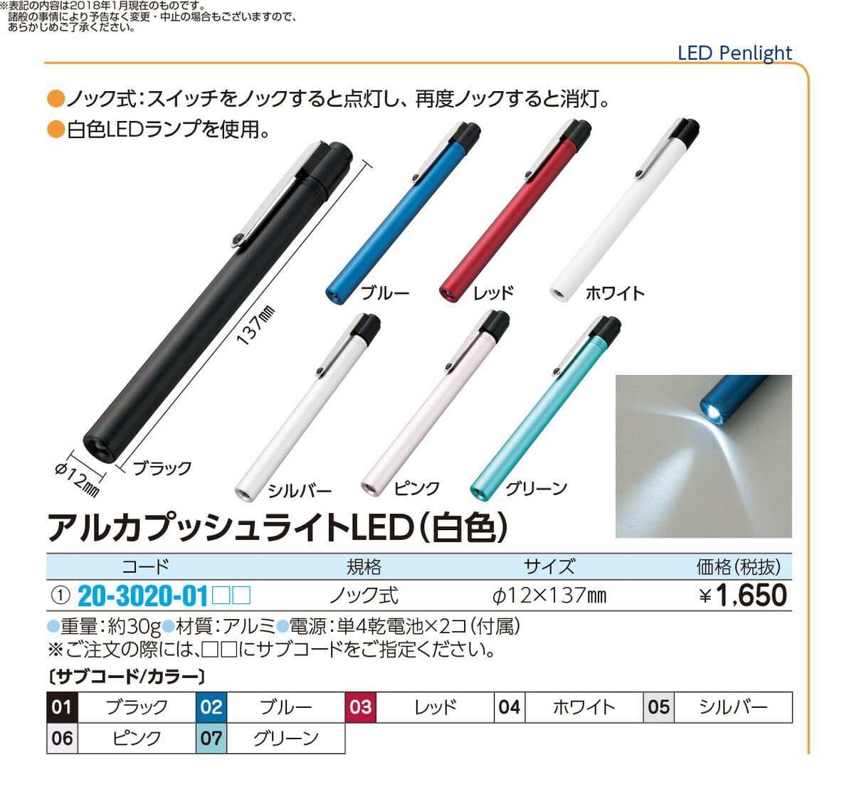 ペンライトアルカプッシュライト(白色 LEDシヨウ(ノックシキ)品番 20-3020-01051入り 医療機器対象外 診察・処置 ペンライト 定価\1650 JAN 4571221980458 ●定価¥1,650円(税別)●商品説明●ノック式:スイッチをノックすると点灯し、再度ノックすると消灯。